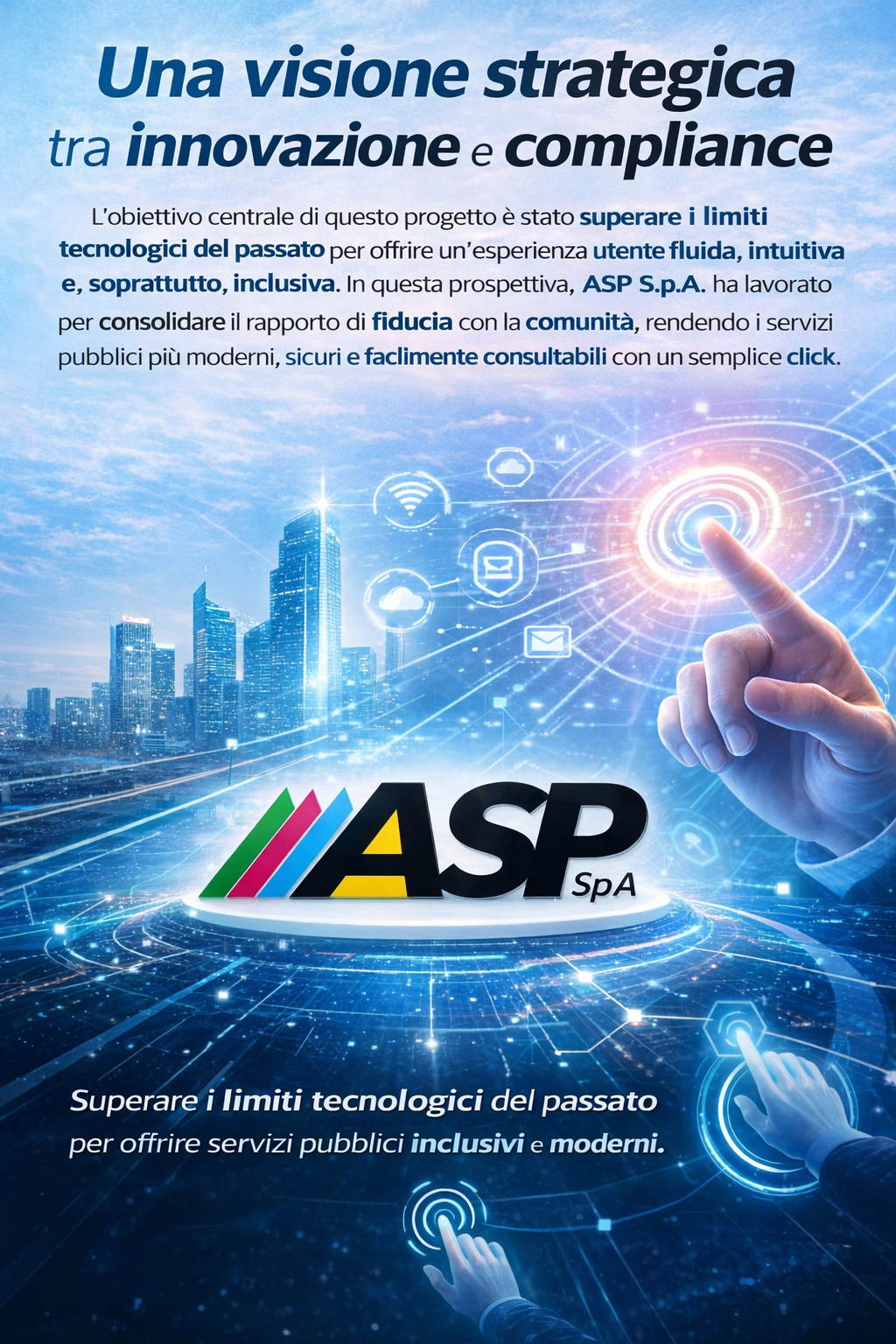 L’obiettivo centrale di questo progetto è stato superare i limiti tecnologici del passato per offrire un’esperienza utente fluida, intuitiva e, soprattutto, inclusiva. In questa prospettiva, ASP ha lavorato per consolidare il rapporto di fiducia con la comunità, rendendo i servizi pubblici più moderni, sicuri e facilmente consultabili con un semplice click.