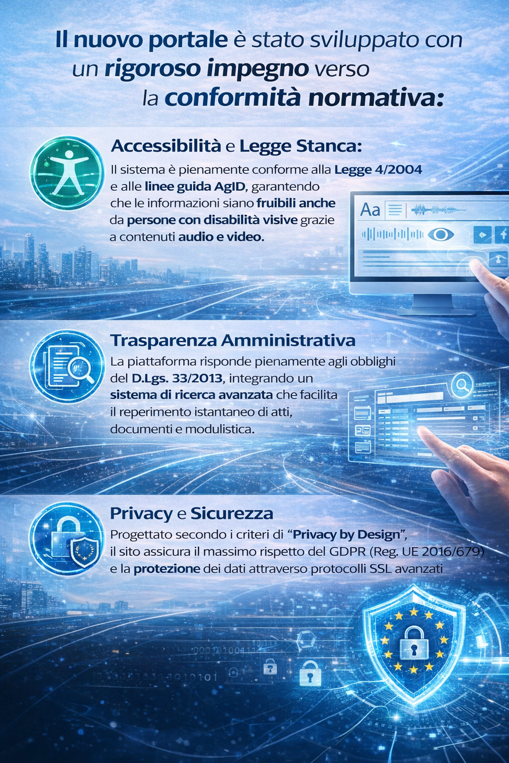 - Accessibilità e Legge Stanca: Il sistema è pienamente conforme alla Legge 4/2004 e alle linee guida AgID, garantendo che le informazioni siano fruibili anche da persone con disabilità visive grazie a contenuti audio e video.