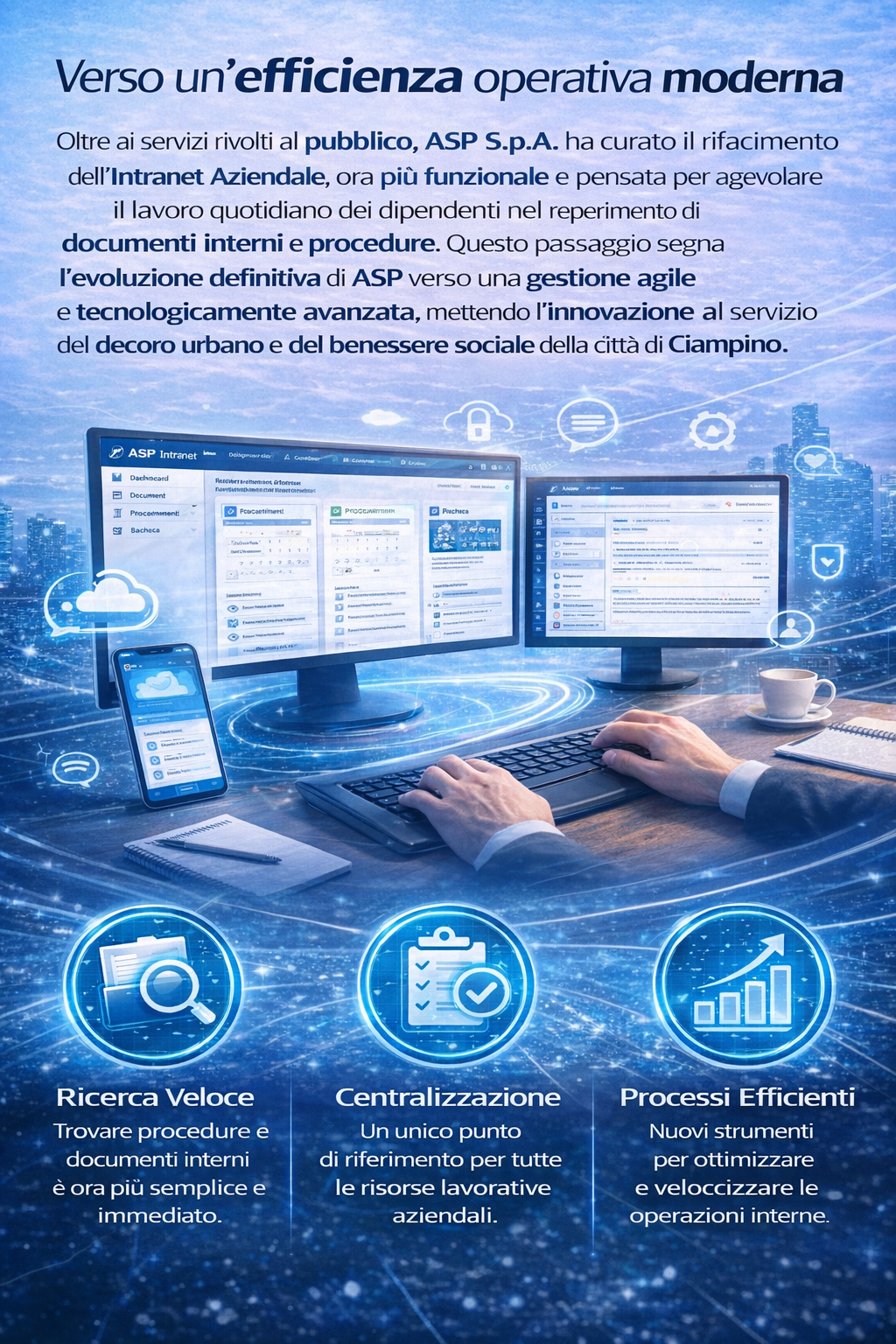 Oltre ai servizi rivolti al pubblico, ASP S.p.A. ha curato il rifacimento dell’Intranet Aziendale, ora più funzionale e pensata per agevolare il lavoro quotidiano dei dipendenti nel reperimento di documenti interni e procedure. Questo passaggio segna l’evoluzione definitiva di ASP verso una gestione agile e tecnologicamente avanzata,