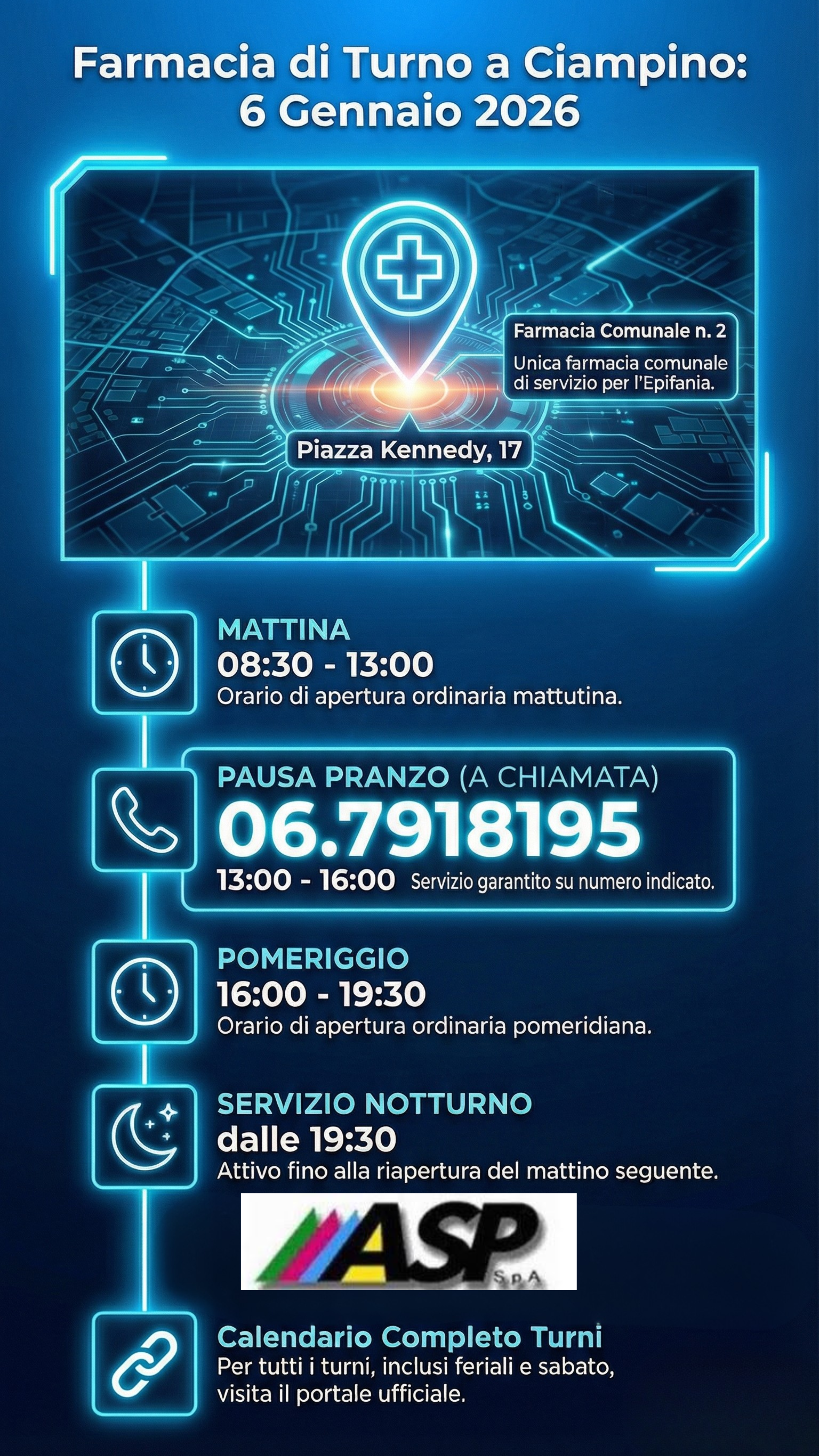 Ciampino, 5 Gennaio 2026 – ASP Spa comunica alla cittadinanza che, in occasione della festività dell’Epifania, il servizio farmaceutico comunale sarà garantito dalla Farmacia Comunale n. 2.