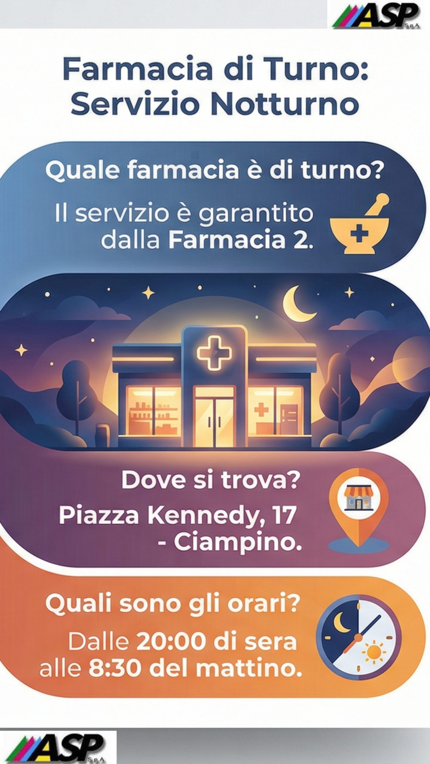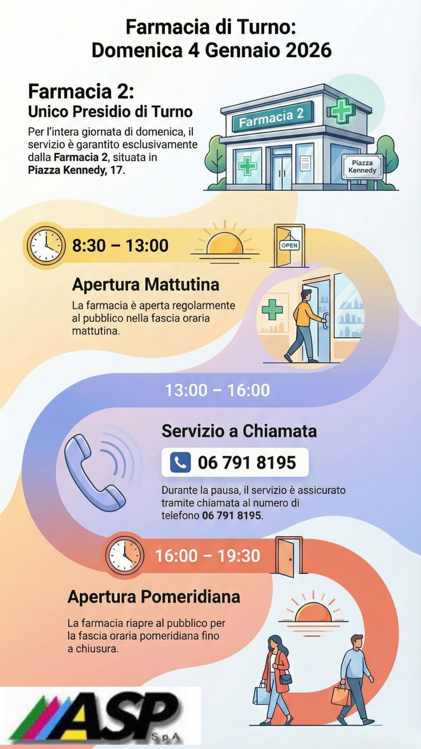Nota importante: Questo comunicato è a titolo informativo. ASP S.p.A. non risponde dell’operato delle farmacie private che non fanno capo alla società. Per eventuali variazioni o aggiornamenti, si invita a verificare direttamente presso la farmacia interessata.