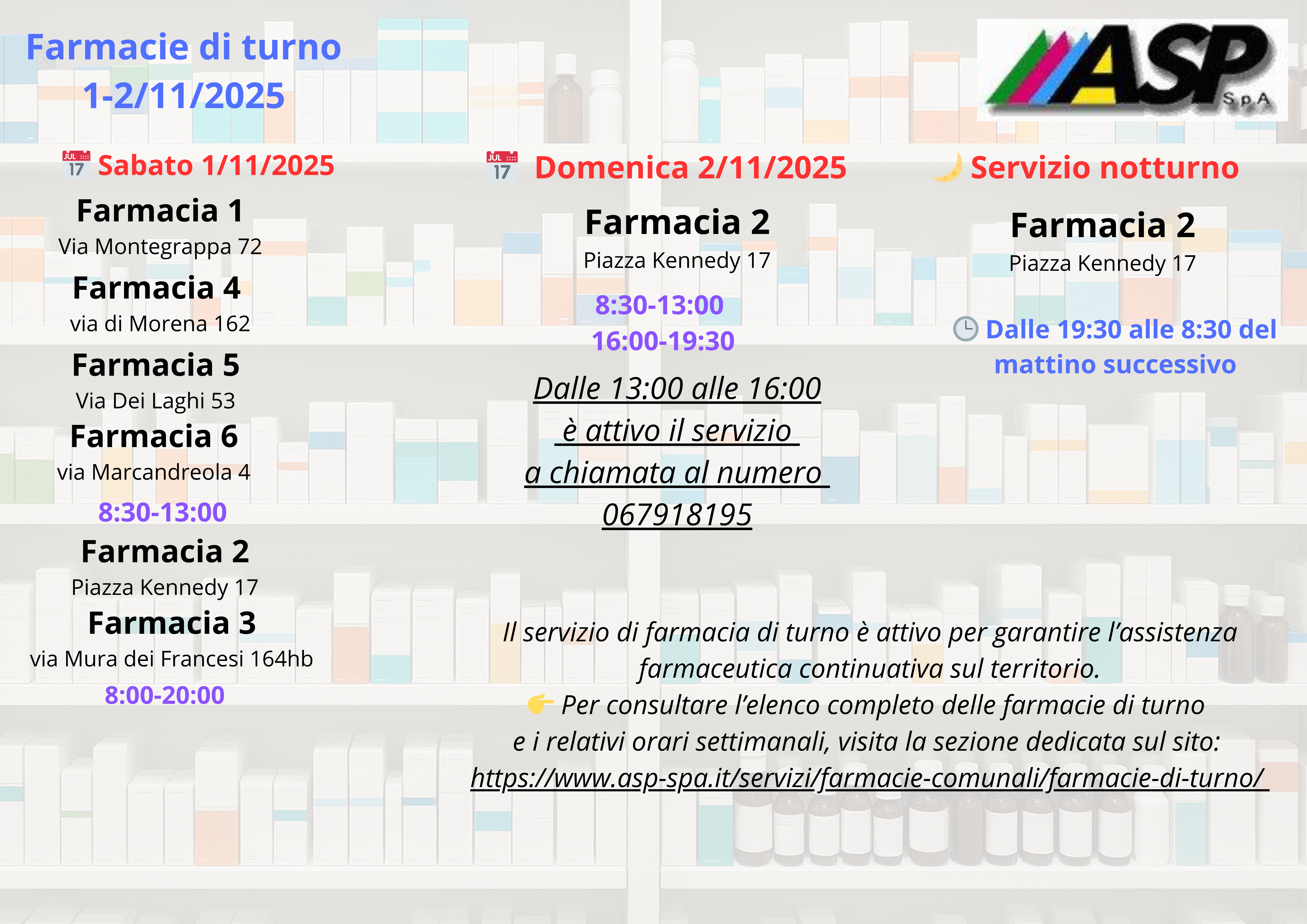 Si ricorda che servizio di farmacia di turno è attivo per garantire l’assistenza farmaceutica continuativa sul territorio. Per consultare l’elenco completo delle farmacie di turno e i relativi orari settimanali, è possibile visitare la sezione dedicata sul sito ufficiale di ASP Spa: https://www.asp-spa.it/servizi/farmacie-comunali/farmacie-di-turno/.