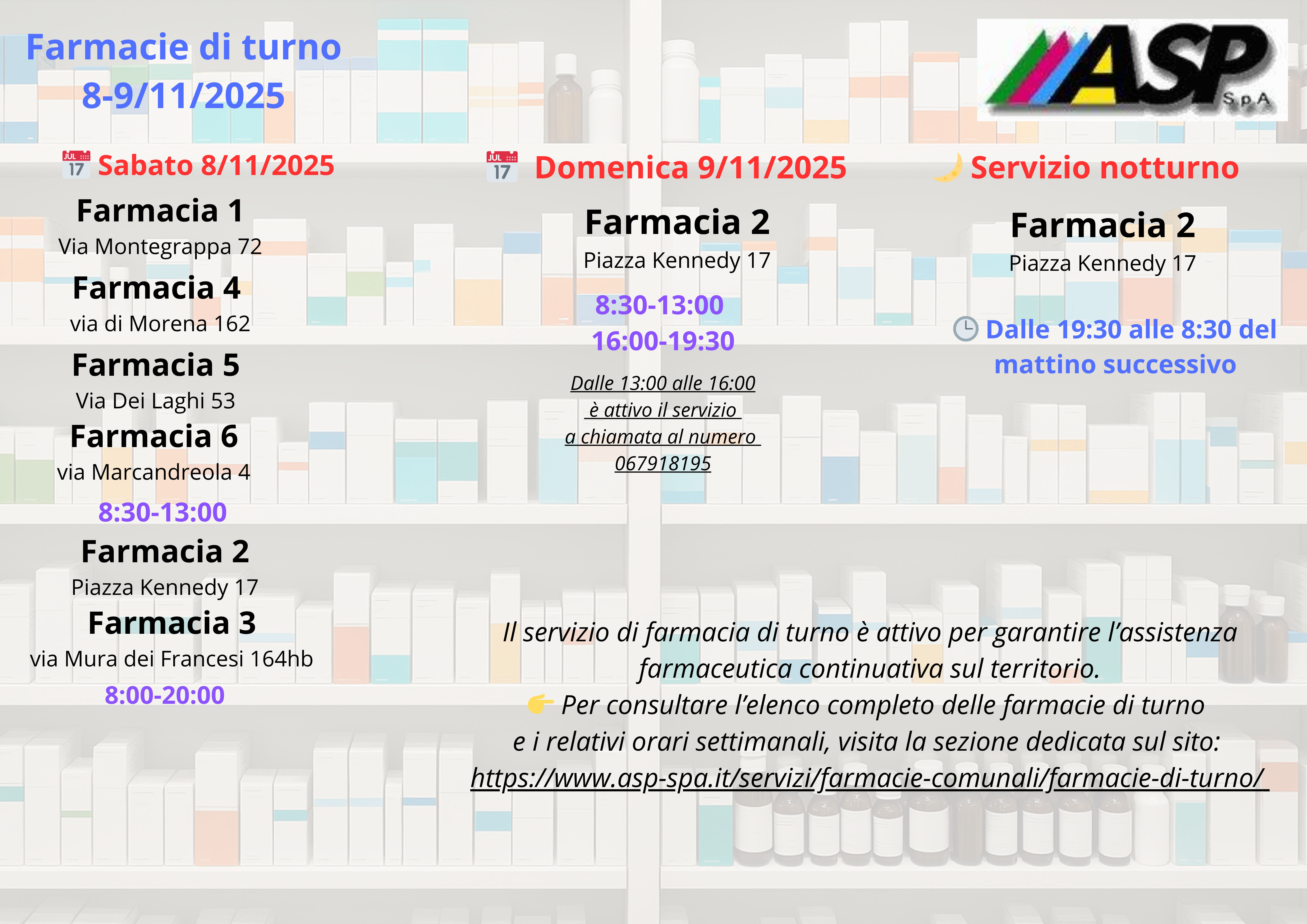 Ciampino ,6 Novembre 2025 ASP Spa informa la cittadinanza che, al fine di garantire l’assistenza farmaceutica continuativa sul territorio di Ciampino, saranno attivi i seguenti turni di farmacia per il weekend del 8 e 9 novembre 2025: