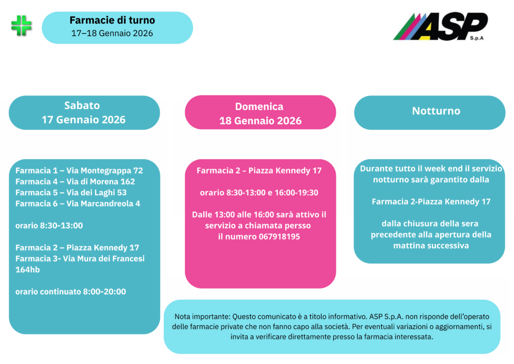 Nota per l’utenza: Il presente comunicato ha valore puramente informativo. ASP S.p.A. declina ogni responsabilità per l’operato di farmacie private non appartenenti alla rete societaria. Per eventuali variazioni dell’ultimo minuto o aggiornamenti, si invita la cittadinanza a verificare le informazioni direttamente presso la farmacia di riferimento.