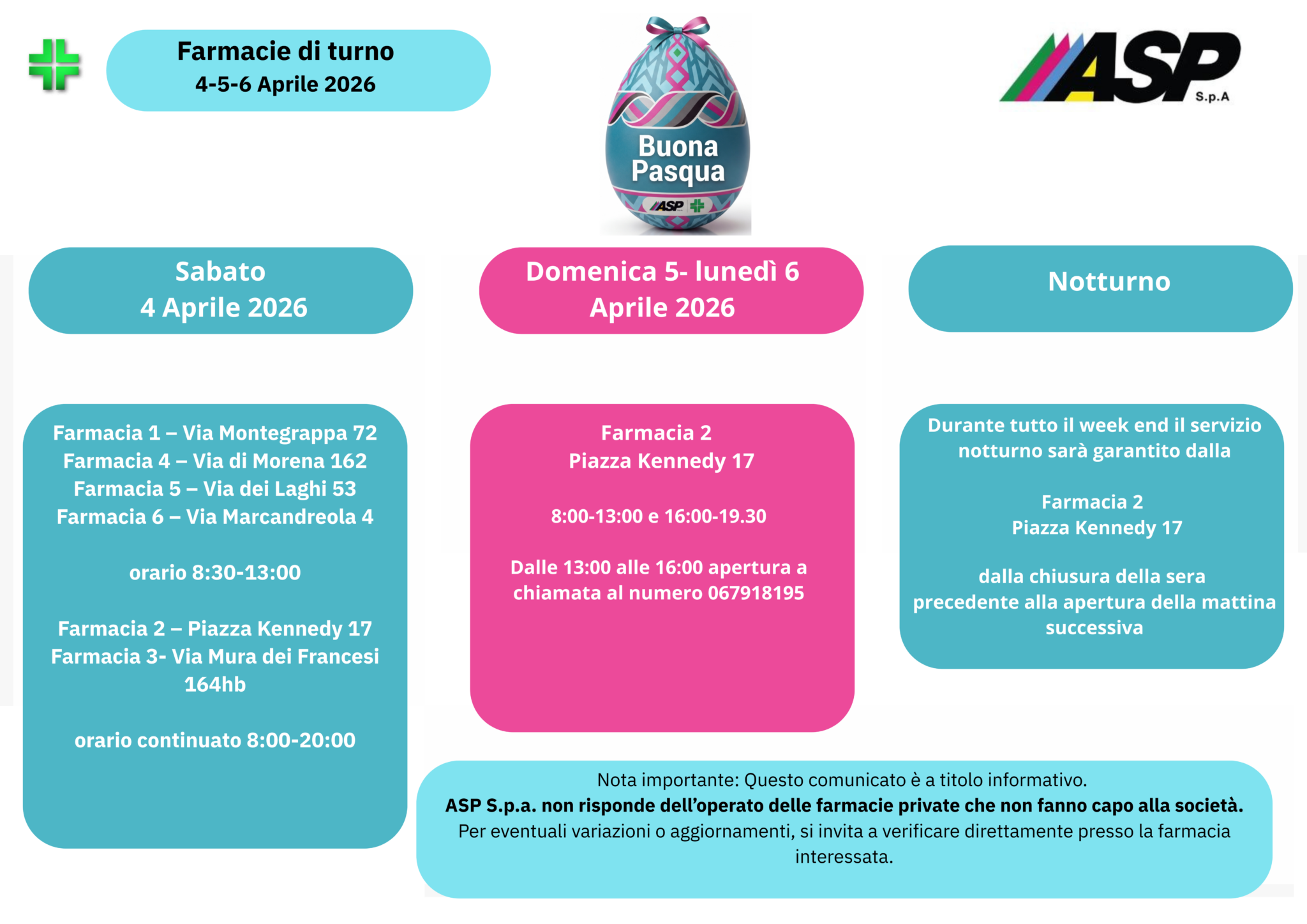 ASP informa la cittadinanza che, in occasione del weekend di Pasqua e della giornata di Pasquetta, il servizio delle Farmacie Comunali sarΓ regolarmente garantito attraverso il sistema delle farmacie di turno, al fine di assicurare continuitΓ assistenziale anche nei giorni festivi.