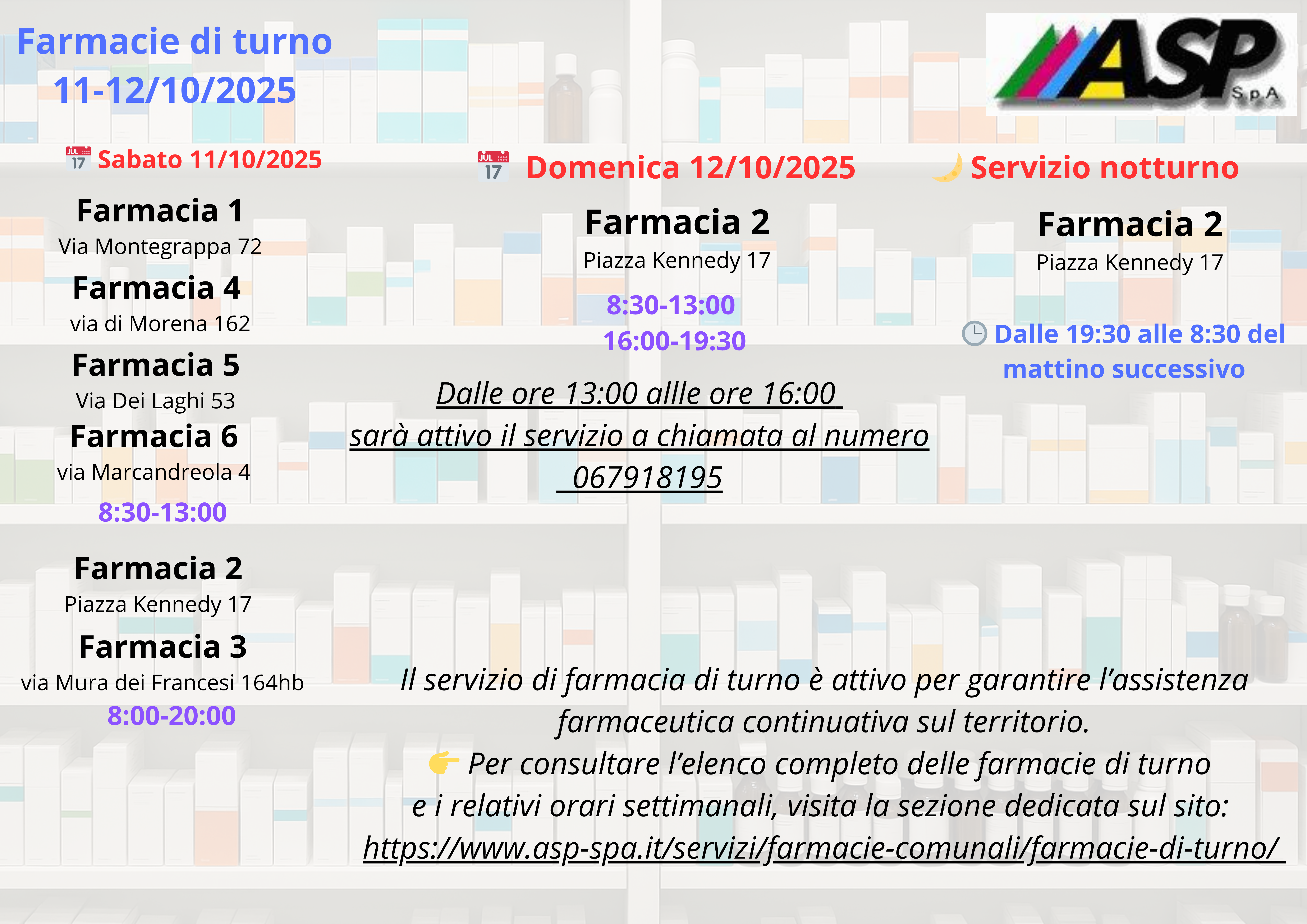 Si ricorda che servizio di farmacia di turno è attivo per garantire l’assistenza farmaceutica continuativa sul territorio. Per consultare l’elenco completo delle farmacie di turno e i relativi orari settimanali, è possibile visitare la sezione dedicata sul sito ufficiale di ASP Spa: https://www.asp-spa.it/servizi/farmacie-comunali/farmacie-di-turno/